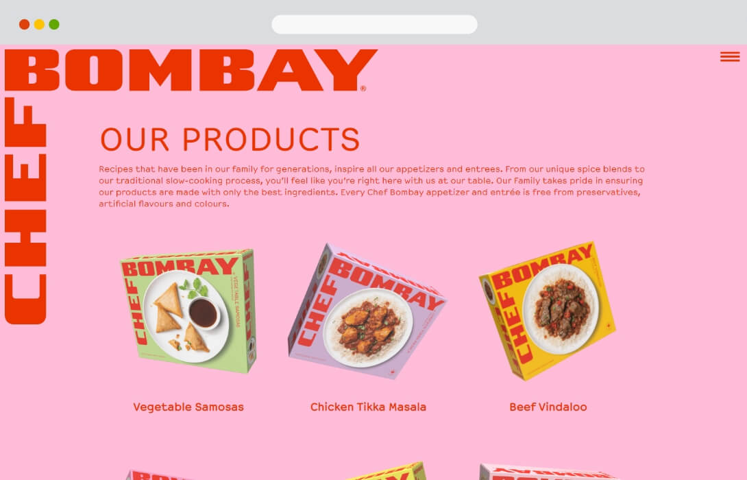 Bold BrandingWe specialize in capturing the spirit of your brand and expressing that online. Integrating conventional elements and unique branding increases brand awareness and reach. Chef Bombay's bold packaging served as a model for their page elements.